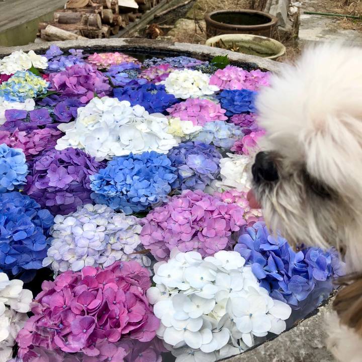 #シーズー #潰れ部 #チョビベロ 鉢の中に#紫陽花 とメダカ