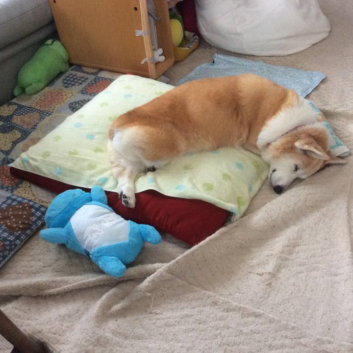 おはようございます💤 #コーギー #14歳 #おはよう #ぬいぐるみ