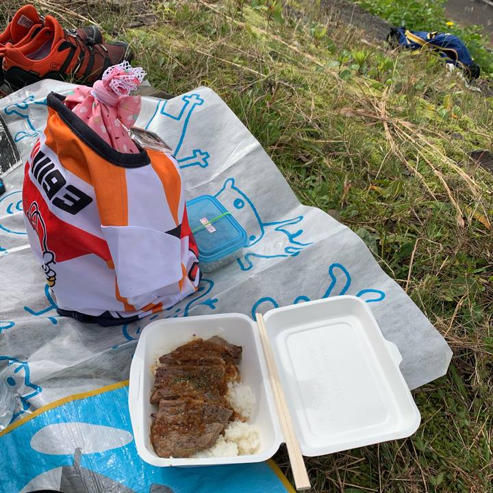 決勝観戦しながら お昼ごはん。 サーロインステーキ丼。 #コーギー #お出掛け