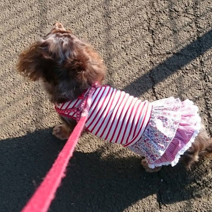 朝のお散歩、寒くなってきたからお洋服着たんだ🎵でもお尻出ちゃってるの💗