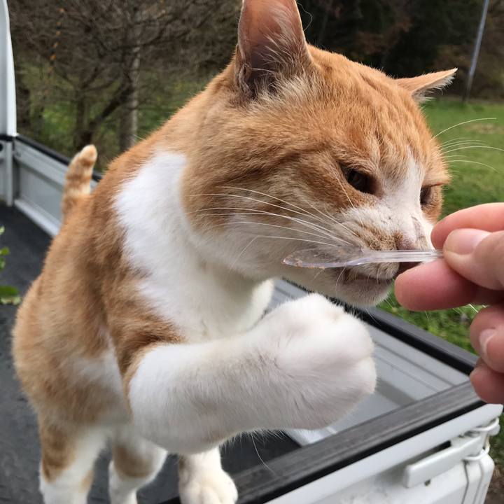 パンチはしなくても食べれるよ〜💧 #牛小屋猫 #缶詰めモグモグ #猫パンチ