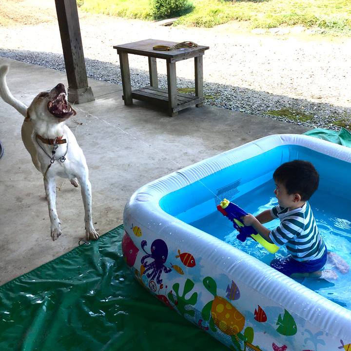 水鉄砲に興奮する晴兄さん🐕💥攻撃を止めない坊や👦#犬と子供