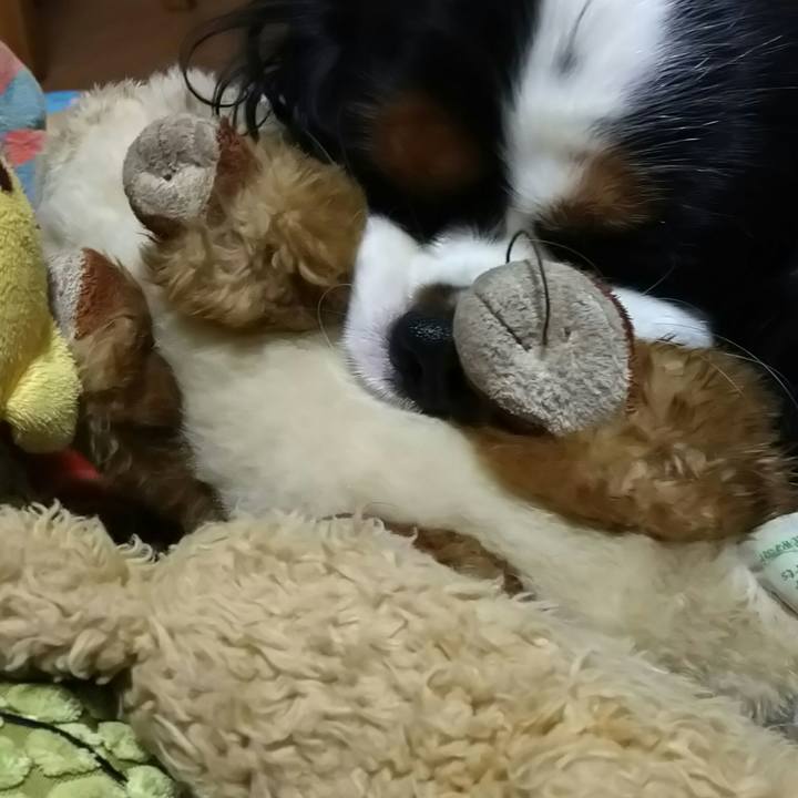 夕食後は必ずぬいぐるみ🐻ハムハムしながらそのまま寝るアポロン😌🌃💤糸とびでてるね