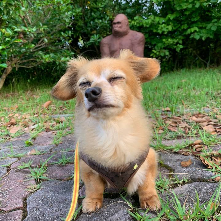 密林担当🦍の前で #いやいやえん #チワックス#ミックス犬#あさんぽ#親分と一緒