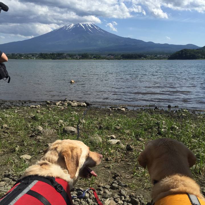 昨日河口湖で初泳ぎ🎵ララの楽しい予感は的中〜#ラブラドール #ラブラドール 多頭