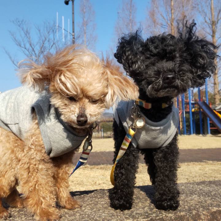 風が強くて冷たいよー😆 #トイプードル#黒プー#朝んぽ#強風#青空#乱れ髪