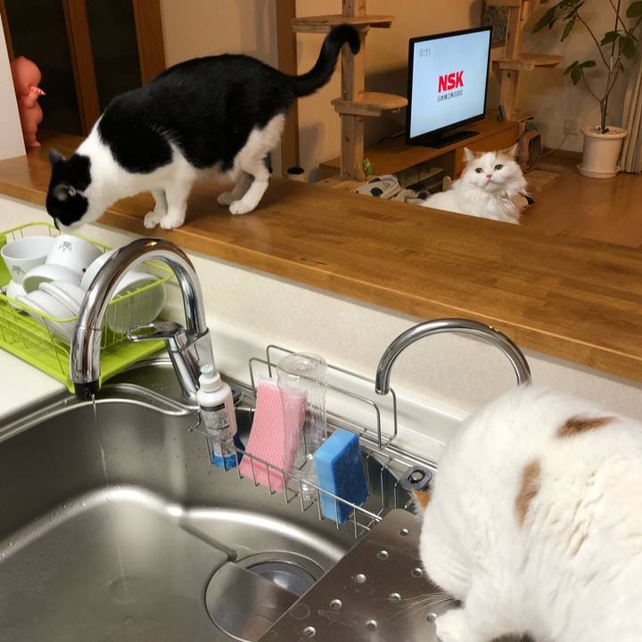 うはよう 今朝のフォーメーション #茶白 #白黒 #シンク隊