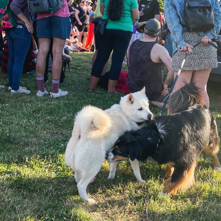 真剣な顔が覗く。タマは無いのでオネーである #PrideFestival🌈#柴犬
