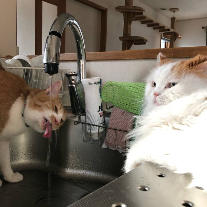テンションの差よ #シンク隊 #茶白 #ハチワレ #水修行