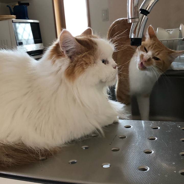 蛇口を奪われ、機嫌が悪いぽとみたん #シンク隊 #茶白 #ハチワレ #水修行