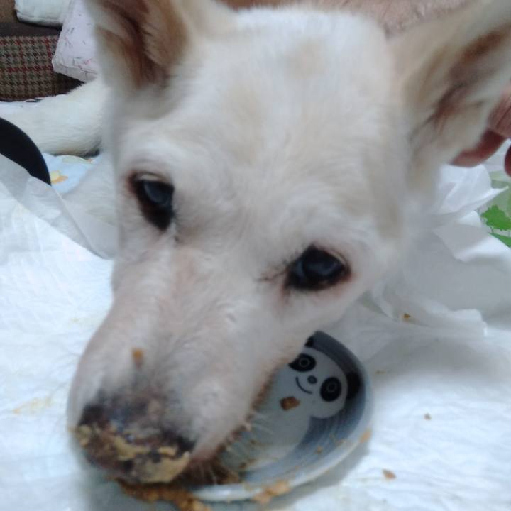 お団子缶詰 口の横から入れ、こぼれ落ちたけどペロペロ😊美味しかったね💗