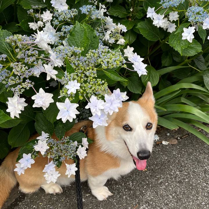 キラキラの下のラフ子✨#コーギー #紫陽花 #ラフ子です