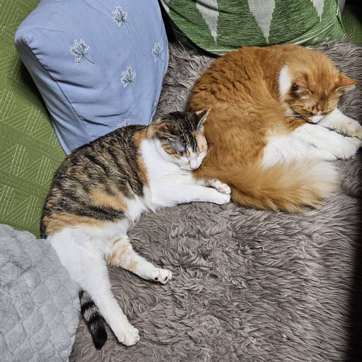 お昼寝は もふもふおけつで いい感じ #ねこ句 #茶白もふ #キジ三毛#仲良し