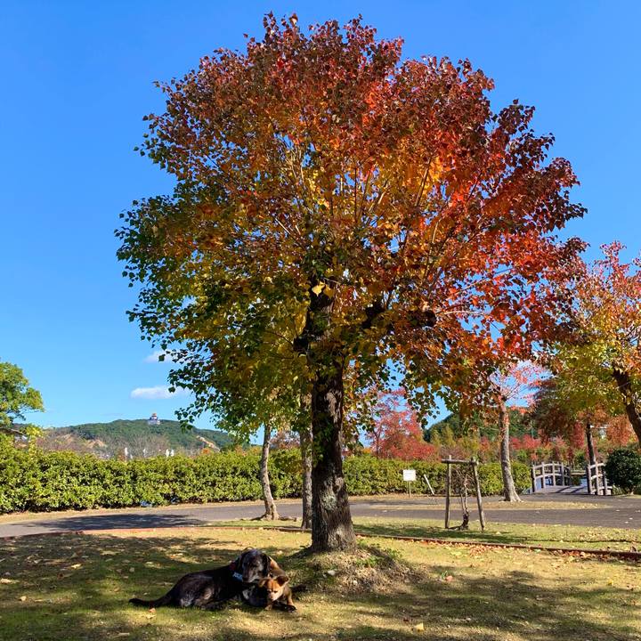 紅葉の下でひとやすみ🍁🐾 #ラブラドール#チワックス#犬の日#さんぽ#紅葉
