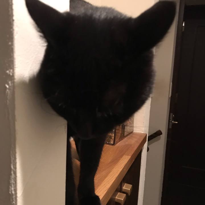 玄関で 謎の物体 お出迎え #黒猫 #ねこ句