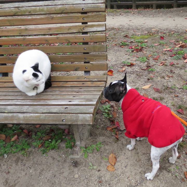 冬の写真ですが💦挨拶したいブリスと激怒のノラちゃん#フレンチブルドッグ#犬と猫