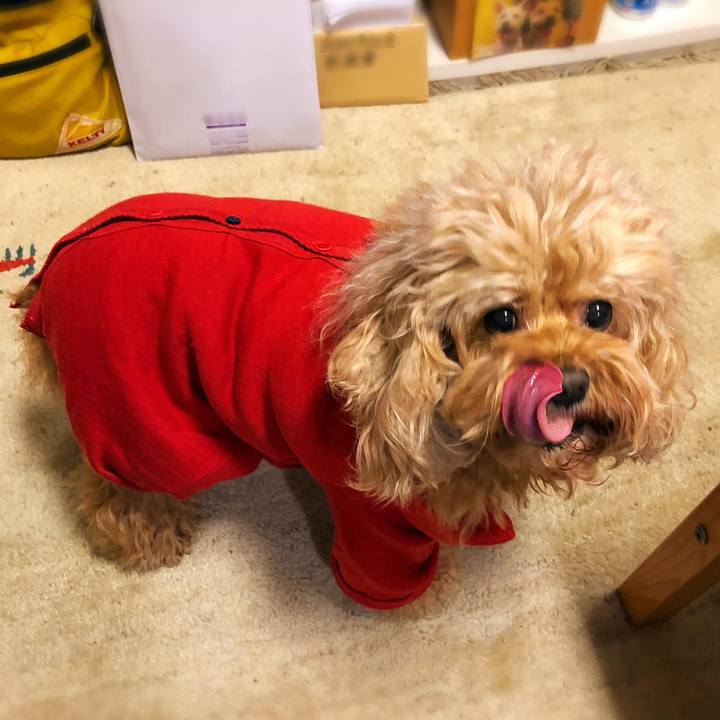 ママンがカーディガンをリメイクして、ふっちゃんのサンタの衣装🎅作ってくりた🐶🎄✨