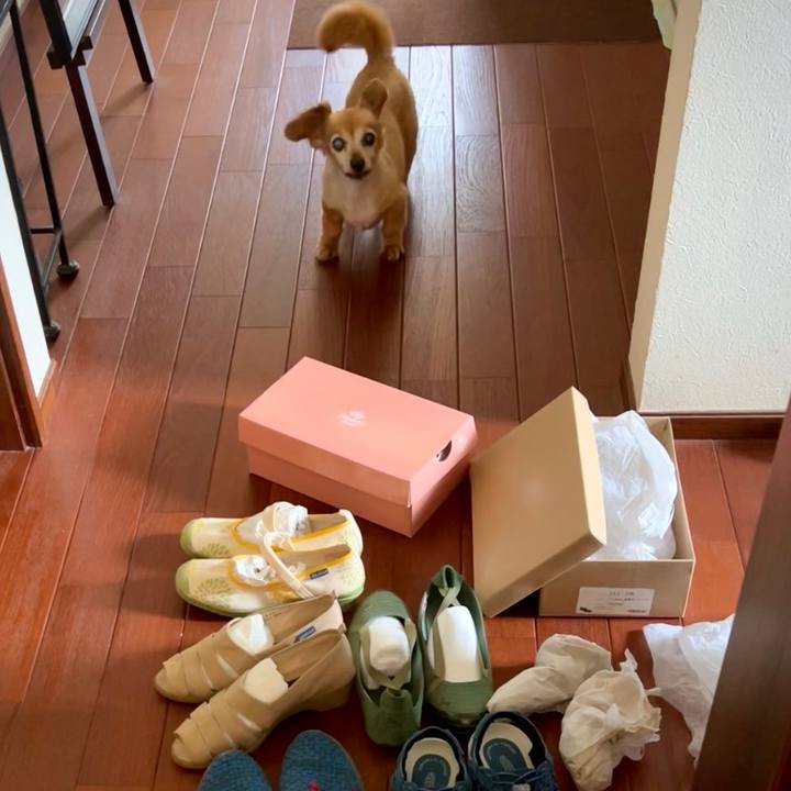 靴の衣替えの途中でやる気を失くした飼い主を 責めるように吠えている福助さん🐶💢