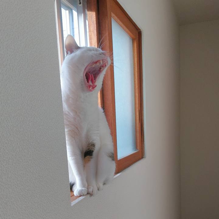 窓際でついこうなるよポカポカで#あくび#マトリョーシカ#ねこ句#窓