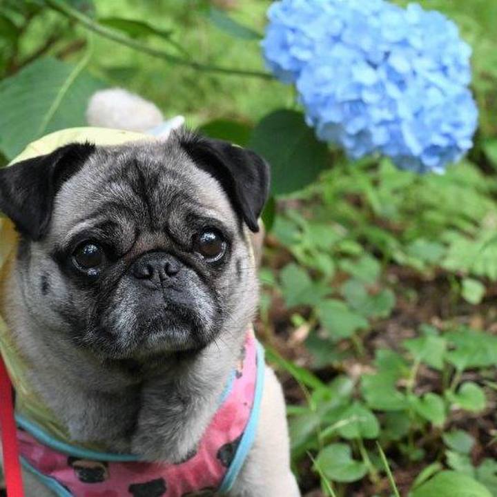 お寺の紫陽花綺麗でした😃雨の合間のお散歩たのしかったです😃#紫陽花#パグ
