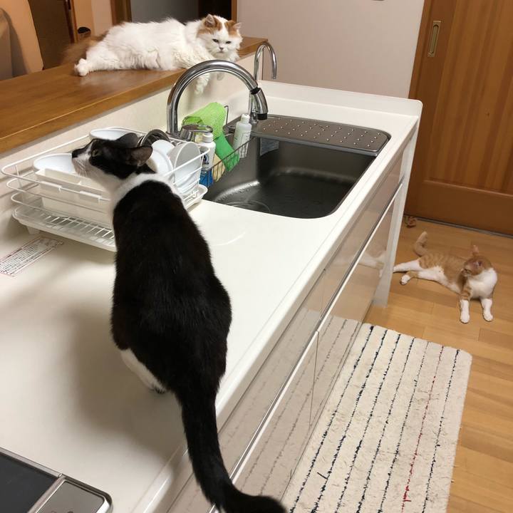 うはよう 今朝のフォーメーション ちーを探してね #茶白 #白黒 #シンク隊