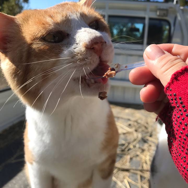 ポロッと #牛小屋猫 #缶詰めモグモグ