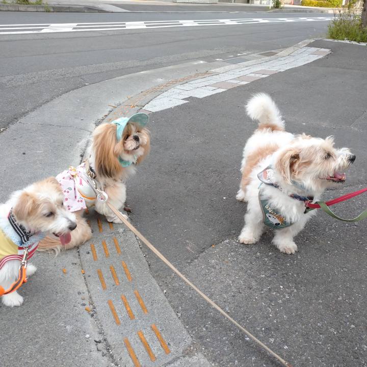 朝散歩で近所のお友達たちと😆 みんな朝早い❗ #ジャックラッセルテリア
