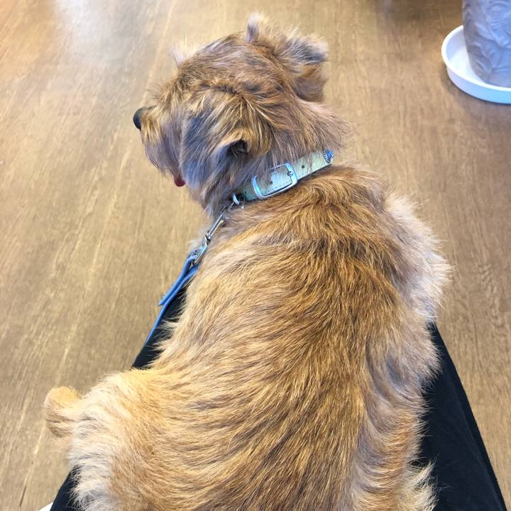 お膝の上はお互いに暑いんですけど #ノーフォークテリア #真夏 #トミイチ眉