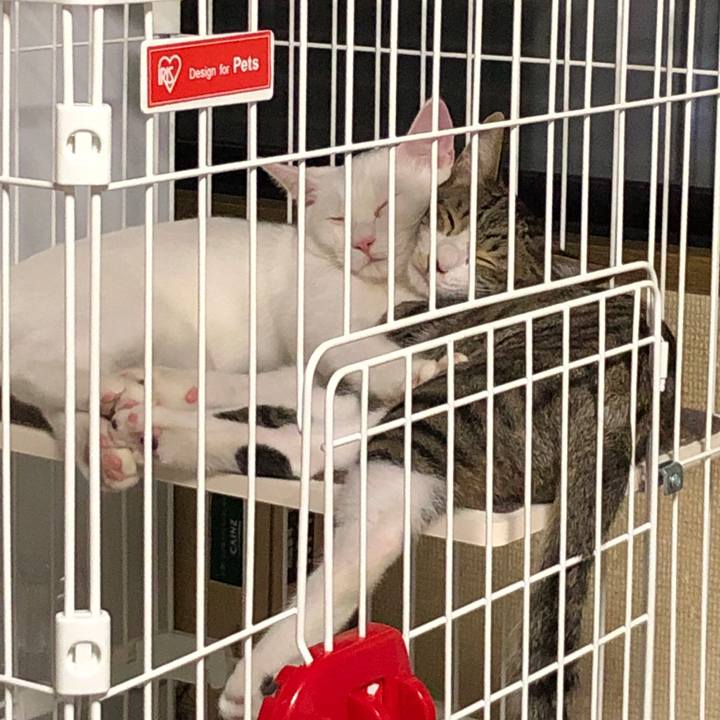 ケージに入ってもぎゅうぎゅう。 他にも段はあるけどくっついて寝る仲良し兄弟。