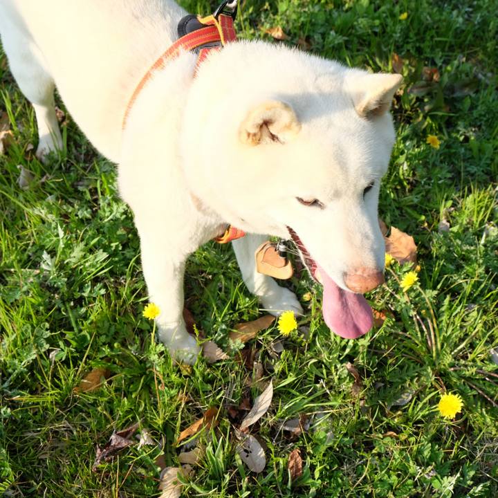 ロン)フワフワまだ⁉ #柴犬#白柴#春の足音#カンサイタンポポ#せんなん里海公園
