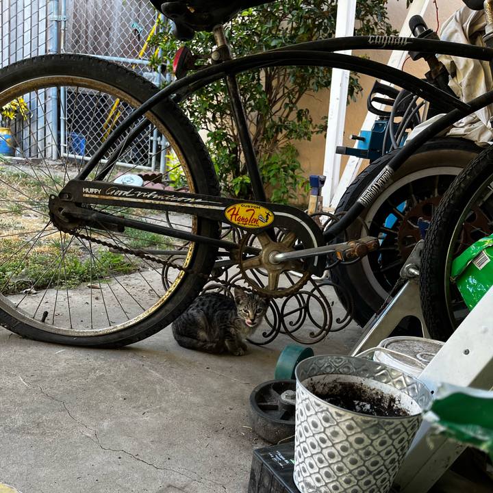食べたあとはやっぱり自転車の下に隠れちゃった。あとでチュールだな😆 #子猫