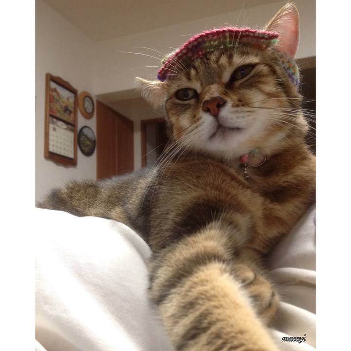 #ねこ句#ねこ人類#帽子#かぶりもの#猫#キジトラ ご飯まで 新作帽の モデル猫