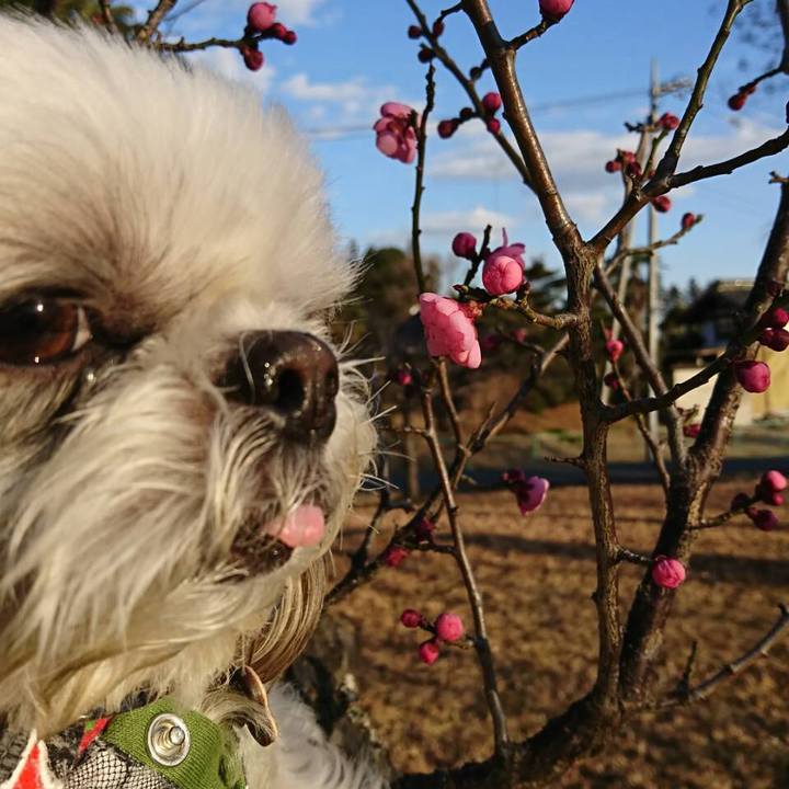 #シーズー #潰れ部 #春#困った とーちゃんとお散歩行ったよ♪ 梅の花咲いてた