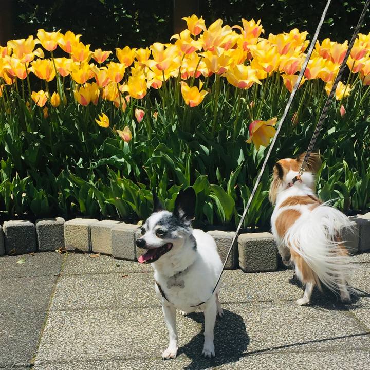並んで映れない🐶🐶たち#光合成#チューリップ#mix犬#チワワ#パピヨン